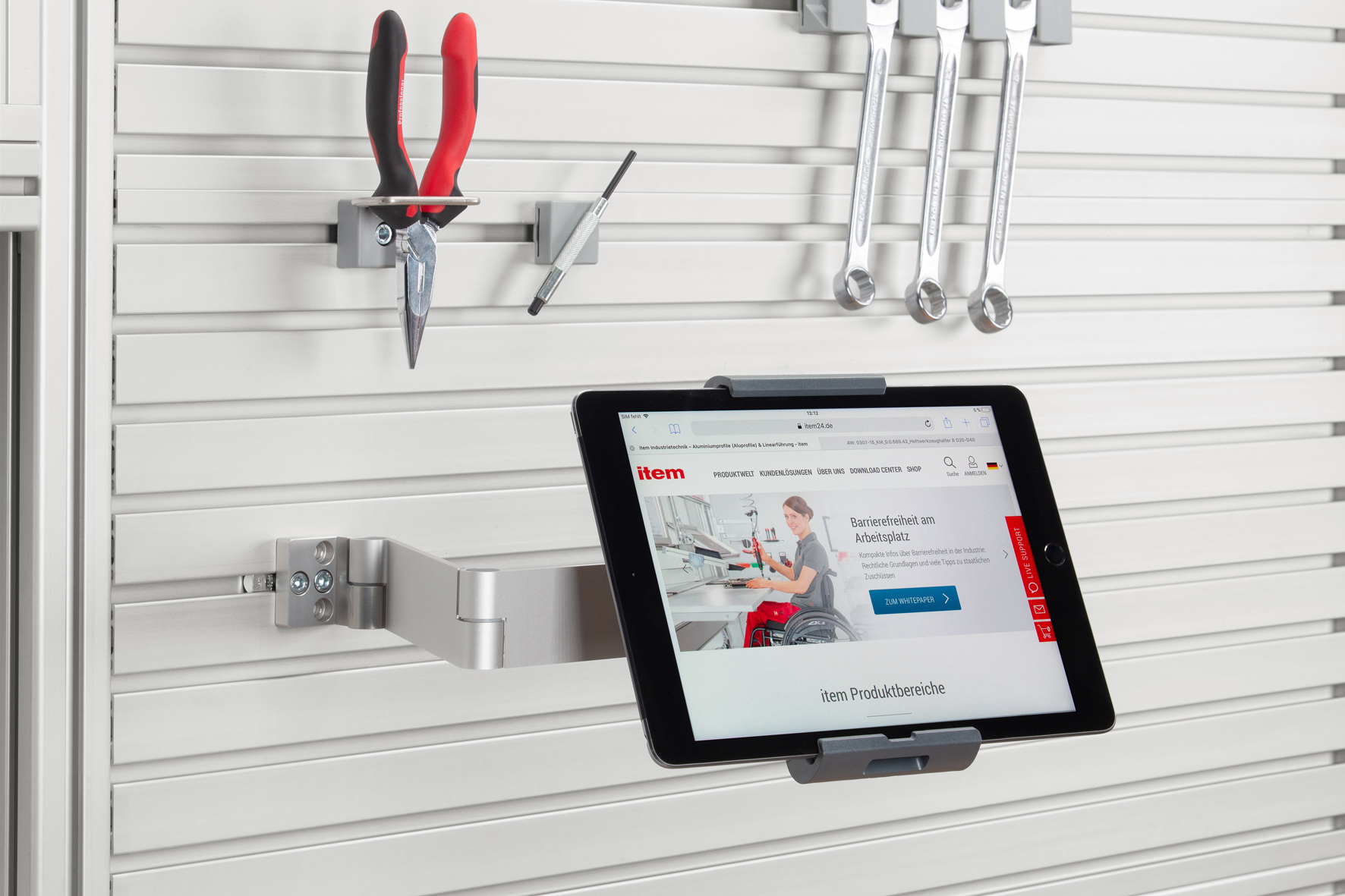 All in all, the new Tablet Holder and Tablet Arm from item offer the ideal tool for ergonomically structuring and arranging industrial work benches.