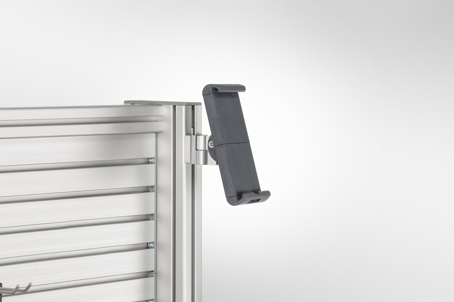 Users can choose between the new item Tablet Holder 8 with three joints and the item Tablet Arm 8 with five joints for positioning their mobile devices. The Double Pivot Arm and the extra Friction Joints provide additional flexibility, making it even easier to achieve the desired position. Both variants allow users to tilt their tablet however they desire and rotate it 360°, ensuring they always have a perfect view of the screen and can switch between landscape and portrait format in next to no time. Thanks to the clamping mechanism, tablets of different sizes can be fitted with ease. Both ends of the clamp open in sync, making it simple to mount and remove mobile devices. A built-in spring mechanism makes sure the tablet is held securely and stops it slipping. The new components also feature a mechanical removal locking device to safeguard against unauthorised access.