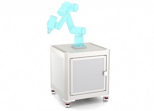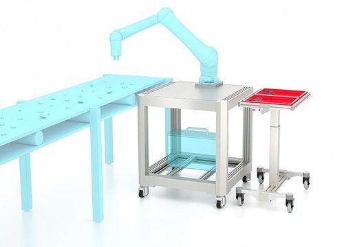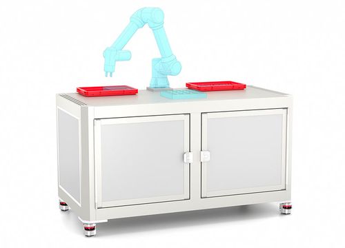 The work surface of this robot workstation has numerous continuous grooves that are open at the sides. This allows fixtures and tools to be easily slid on at the front and fixed to fit.