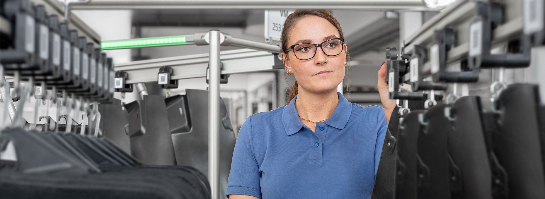 When parts take up a lot of space in a small load carrier or can easily become caught up together, the item Suspended Conveyor System offers an ingenious alternative solution. Cable harnesses or mats can be hung up or placed in bags so they can be efficiently moved around for further processing.